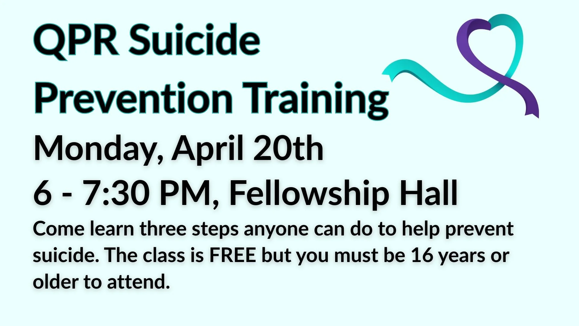 Come learn three steps anyone can do to help prevent suicide. The class is FREE, but you must be 16 years or older to attend.